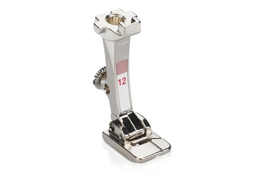 Bulky Overlock Foot #12 is suitable for sewing knits, as well as for making and attaching piping and cords.