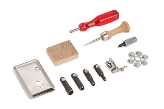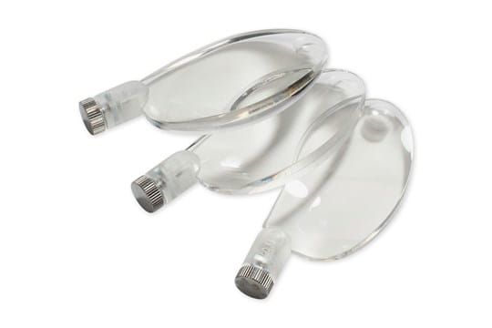 The Magnifying Lens Set consists of a machine mounting bracket and three lenses of different strengths for optimal magnification of the work area.
