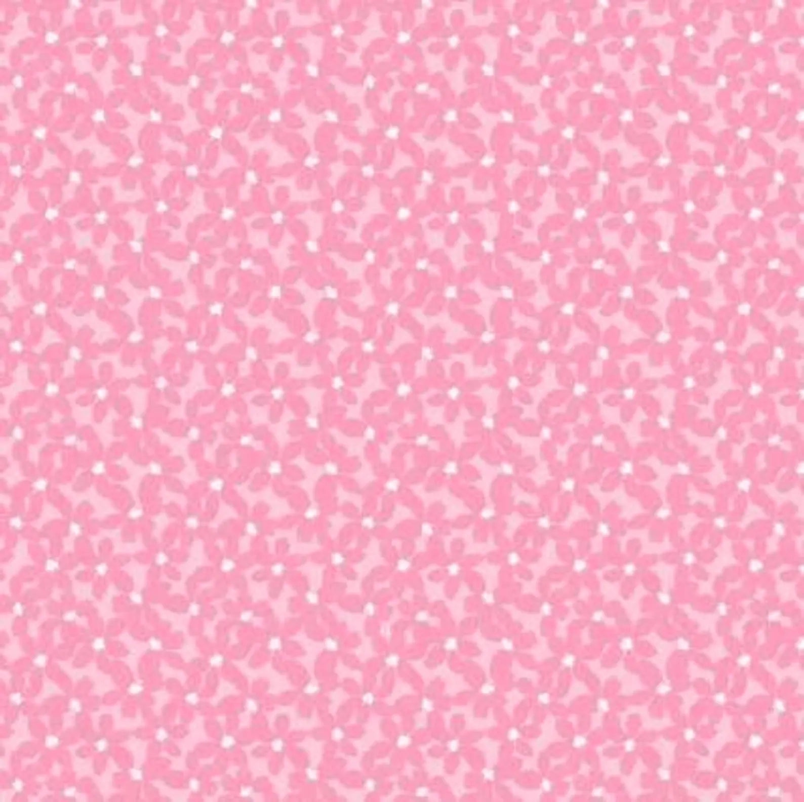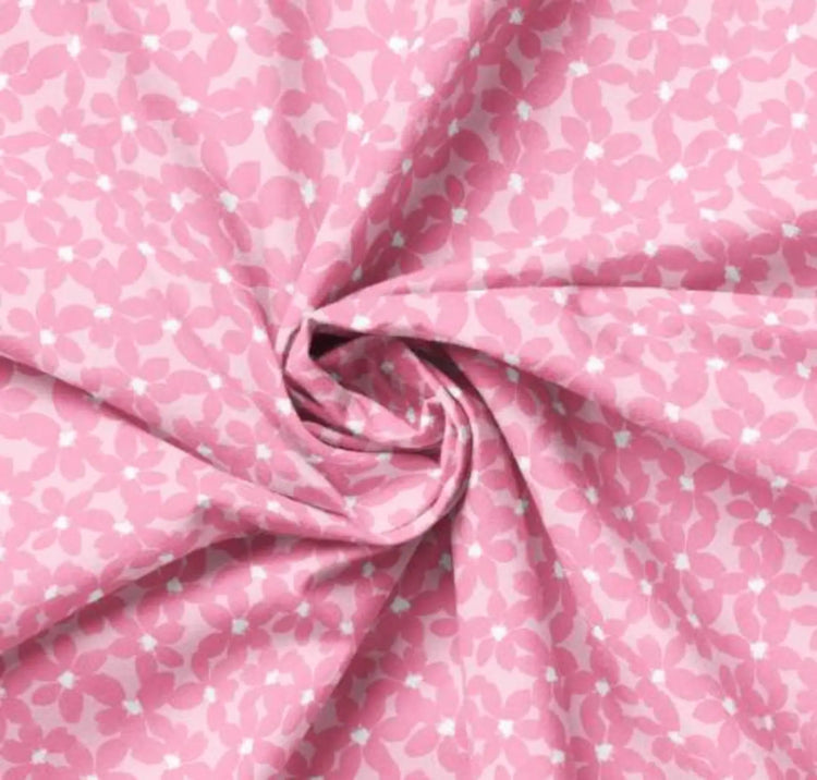 The Daisy and Lilly cotton fabric features soft pink floral designs with daisies, lilies, hearts, and plaid patterns. Its gentle pastel colors make it ideal for quilting and craft projects with a sweet, dreamy look.