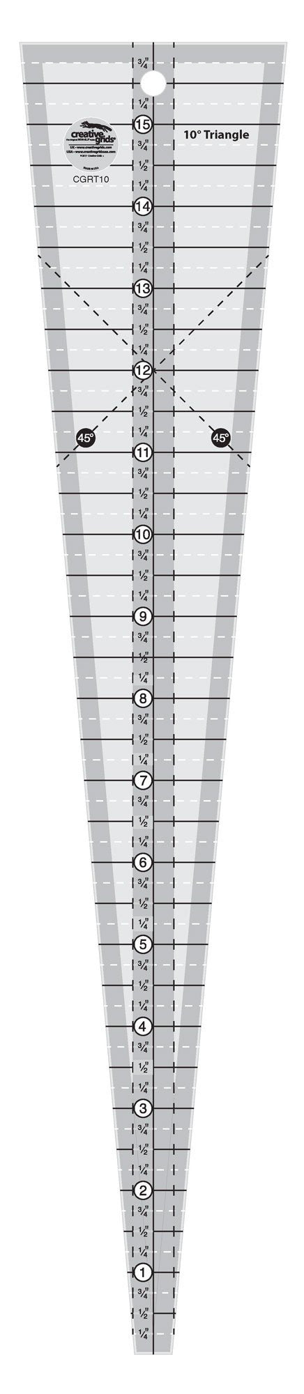 Sew together 36 of these 10 degree triangles to create a complete circle; 18 to create a half-circle; or 9 to create a quarter-circle. Create Fans, Dresden Plates, etc. up to a finished size of 31-1/2in. Total ruler length is 16in.