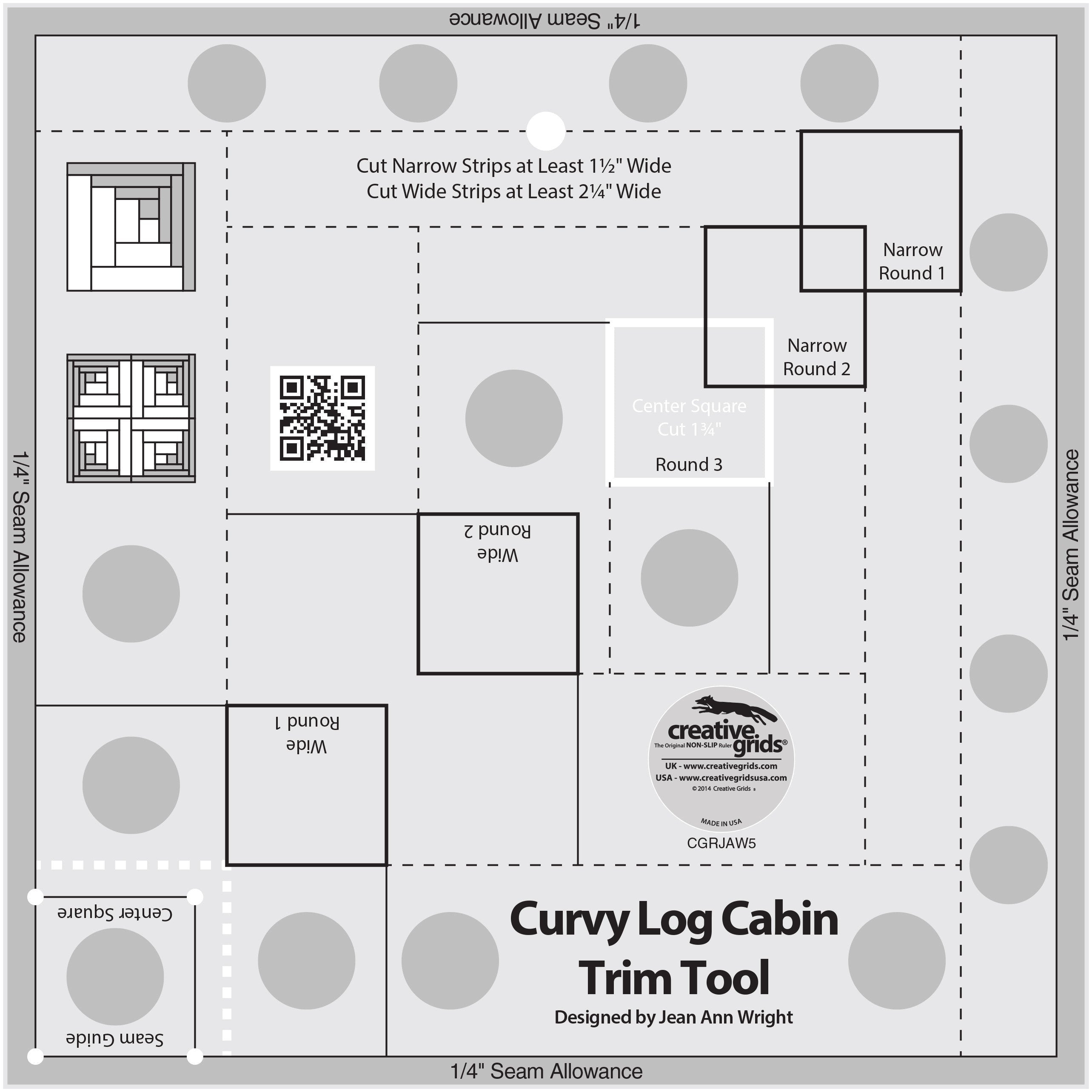 Create the illusion of curves with this 8 inch Curvy Log Cabin Trim Tool. Sewing narrow strips to two adjoining sides of the center square and wide strips to the remaining two sides create the curve. Mark the wrong side of the center square through the holes on the tool to ensure a perfect seam allowance. Then sew a round – two narrow and two wide strips – and trim. Add two more rounds to complete a perfect 8 inch finished block. The cutting requirements for the narrow and wide strips and the center square are printed right on the tool. Sew four blocks together to “piece” a circle which finishes to 16 inches. Combine these blocks with traditional 8 inch log cabin blocks created with the Creative Grids Log Cabin Trim Tool (CGRJAW1) for unlimited design potential.