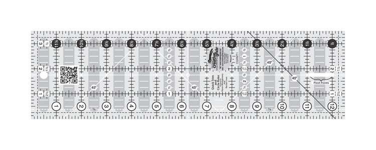 The Quick Trim and Circle Ruler is available in two sizes – 3-1/2 x 12-1/2 inches (Item CGRMT1) and 4-1/2 x 24-1/2 inches (Item CGRMT5). Both rulers include the Turn-a-Round feature as well as all of the markings of a traditional Creative Grids® ruler. White 45 degree angle lines that cross at the 1/4 inch line, are printed on both sides of the ruler. Use these lines to cut binding and border strips perfectly as well as cut and trim flying geese units. Use the holes drilled in the center to draw circles up to 22 inches using the smaller ruler and up to 46 inches using the larger ruler.