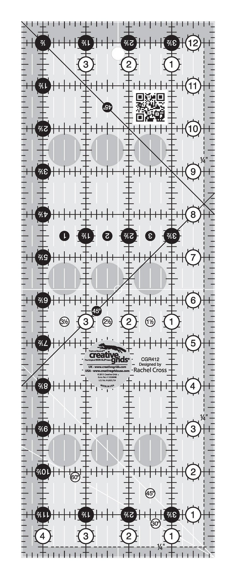 This 4-1/2 x 12-1/2 inch rectangle ruler features easy-to-read black and white markings printed in 1 inch grids marked in 1/8 and 1/4 inch increments. Use the easy-to-read, black numbers (printed on white dots) and the 1/4 inch grip sides to cut whole inches. The 1/4 inch dashed lines printed on two adjoining sides aid in trimming seam allowances. Use the patented Turn-A-Round feature – designated by the easy to read, numerical white numbers (printed on black dots) and the 1/2 inch grip sides – to add the 1/2 inch seam allowance. Use the white 45 degree angle to trim half-square triangles in whole inch increments. Use the black 45 degree angle to trim half-square triangles in half inch increments. An additional black 45 degree line is placed so that two angles cross 1/4 inch away from the outside edge. Use these markings to square up flying geese units; squares set on point or mark cross-hatching. The ruler also features a 30degree/60degree angle. White horizontal and vertical lines are printed on the rectangle so the center of the ruler is easily distinguishable. Use these lines to fussy cut stripes and borders.