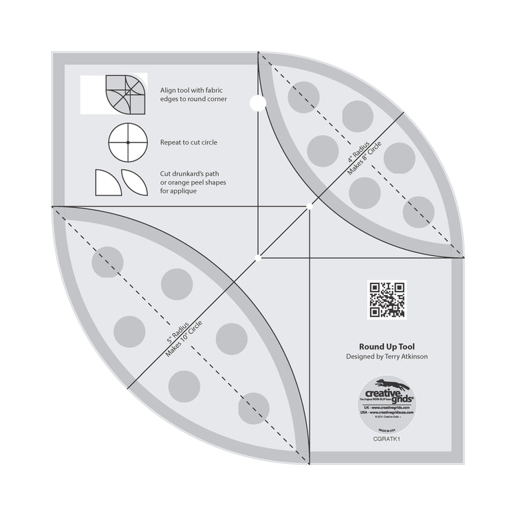 Use the Creative Grids® Round Up tool for rounding corners on placemats, table runners and quilts. Gentle curves in two sizes are easy to bind - no need to stop and turn at each corner! You can also cut 8 or 10 inch circles for potholders and applique. Cut drunkard's path, orange peel or petal shapes for applique. Great to use with pre-cut 5, 7, and 10 inch squares!