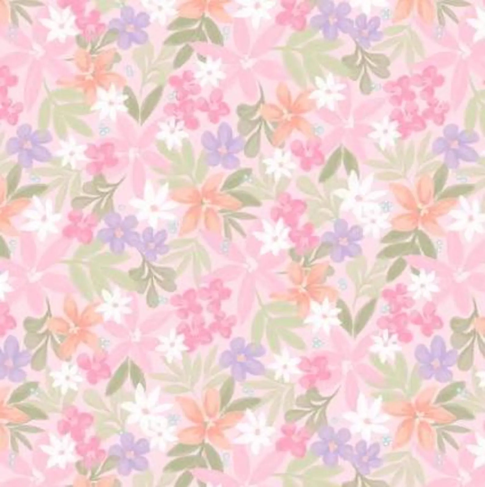 The Daisy and Lilly cotton fabric features soft pink floral designs with daisies, lilies, hearts, and plaid patterns. Its gentle pastel colors make it ideal for quilting and craft projects with a sweet, dreamy look.
