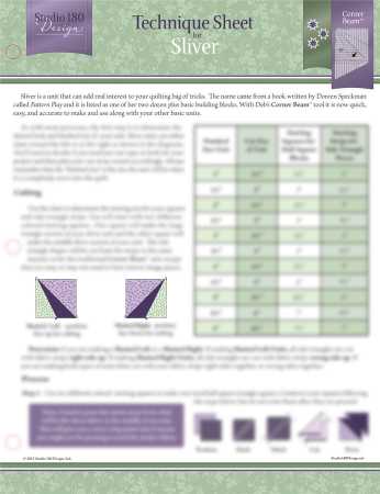 Elevate your quilting projects with this innovative technique sheet designed for creating slivers in your designs. This sheet provides a detailed guide to adding a unique touch to your quilts with precision and ease. The guide includes instructions on cutting, sewing, and pressing, ensuring you can integrate slivers seamlessly into your work. With visual aids showing different cutting angles and a reference table for various measurements, this tool is indispensable for both novice and experienced quilters. It features a green background with purple and white geometric patterns, enhancing the visual appeal while providing practical information. The sheet also includes a diagram of a quilt block with slivers integrated, demonstrating the final look of your project. Technique sheet for adding slivers to quilts Detailed instructions on cutting, sewing, and pressing Visual aids for cutting angles and measurement table Suitable for both novice and experienced quilters Features green background with purple and white geometric patterns Includes diagram of quilt block with slivers