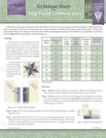 Discover the art of creating stunning Lemoyne Star blocks with this technique sheet from Studio 180 Design. This guide provides a detailed method for strip piecing diamond shapes to form vibrant and intricate Lemoyne Stars, enhancing your quilt designs with precision and ease. Whether you're a seasoned quilter or just starting out, this sheet offers step-by-step instructions, helpful diagrams, and a convenient chart to ensure your stars are perfectly aligned. With this tool, you can add a unique flair to your quilts, making them stand out with their geometric beauty and color coordination. Technique: Strip Piecing Focus: Lemoyne Stars Features: Step-by-step instructions, diagrams, and alignment chart Ideal for: Quilters of all skill levels Enhances: Quilt designs with precision and ease