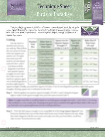 Discover the art of precision quilting with the Birds of Paradise Technique Sheet from Studio 180 Design. This sheet guides you through creating a stunning traditional block by using large flying geese units and adding intricate details. You'll learn to make four units with meticulous accuracy, enhancing your quilting skills. The sheet includes a comprehensive layout with color-coded sections for different fabric cuts, ensuring clarity in your project. The vibrant purple and green design elements, along with detailed step-by-step instructions, make this sheet both functional and visually appealing, perfect for quilters of all levels. Technique Sheet for creating Birds of Paradise block Uses large flying geese units for traditional block design Guides through making four units with precision Includes color-coded fabric cut guide Features detailed step-by-step instructions Enhances quilting skills for all levels Vibrant purple and green design elements