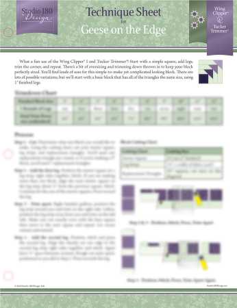 This technique sheet introduces "Geese on the Edge," a method that combines the Wing Clipper® and Tucker Trimmer® tools to create a simple square, add logs, and make a completed block with precision. Ideal for quilters looking to add a unique twist to their projects, this guide helps you form perfectly sized geese that fit seamlessly into your designs. The process starts with a basic block and uses the Tucker Trimmer® to ensure all pieces are uniform, enhancing the overall aesthetic of your quilt with a professional finish. The sheet includes detailed steps and visual aids, featuring images of the tools in action, block diagrams, and finished quilt examples, all designed to simplify your quilting journey. Combines Wing Clipper® and Tucker Trimmer® tools Creates a simple square with added logs Ensures precision in block construction Ideal for adding a unique twist to quilt designs Includes detailed steps and visual aids Features block diagrams and finished quilt examples Enhances quilt aesthetics with a professional finish