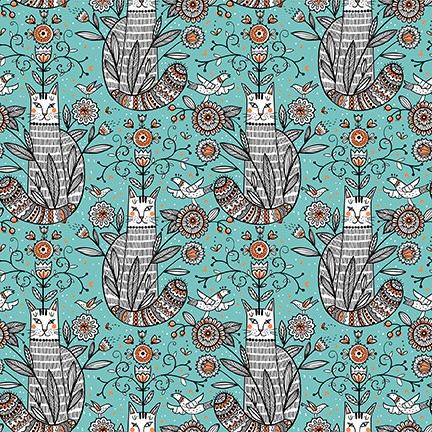 Whimsy - Cats Teal Yardage (Sold By 1/2 Meter)