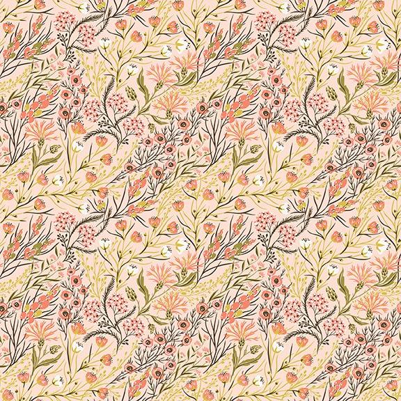 Create a whimsical and playful aesthetic with Whimsy by In the Beginning Fabrics. Delicate florals and branches in shades of pink and light green dance across a pale peach background, adding a touch of magic to any sewing project. Perfect for all your floral creations.