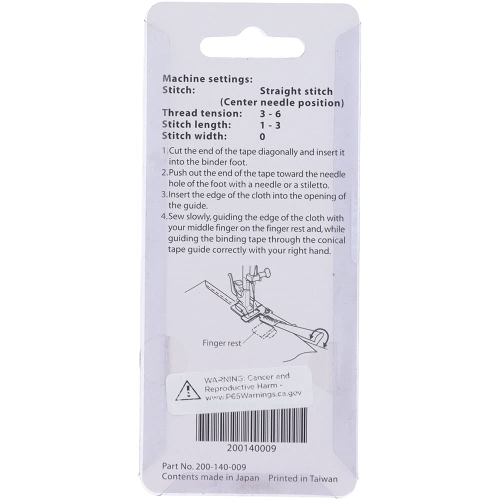 Snap-On Binder Foot, accommodates up to 1/4" bias tape using straight, zig zag or decorative stitches.