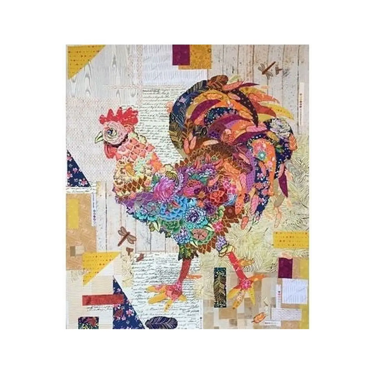 Laura Heine's Doodle-Doo the Rooster collage pattern. Full size pattern and complete instructions included. Finished size 35x42.